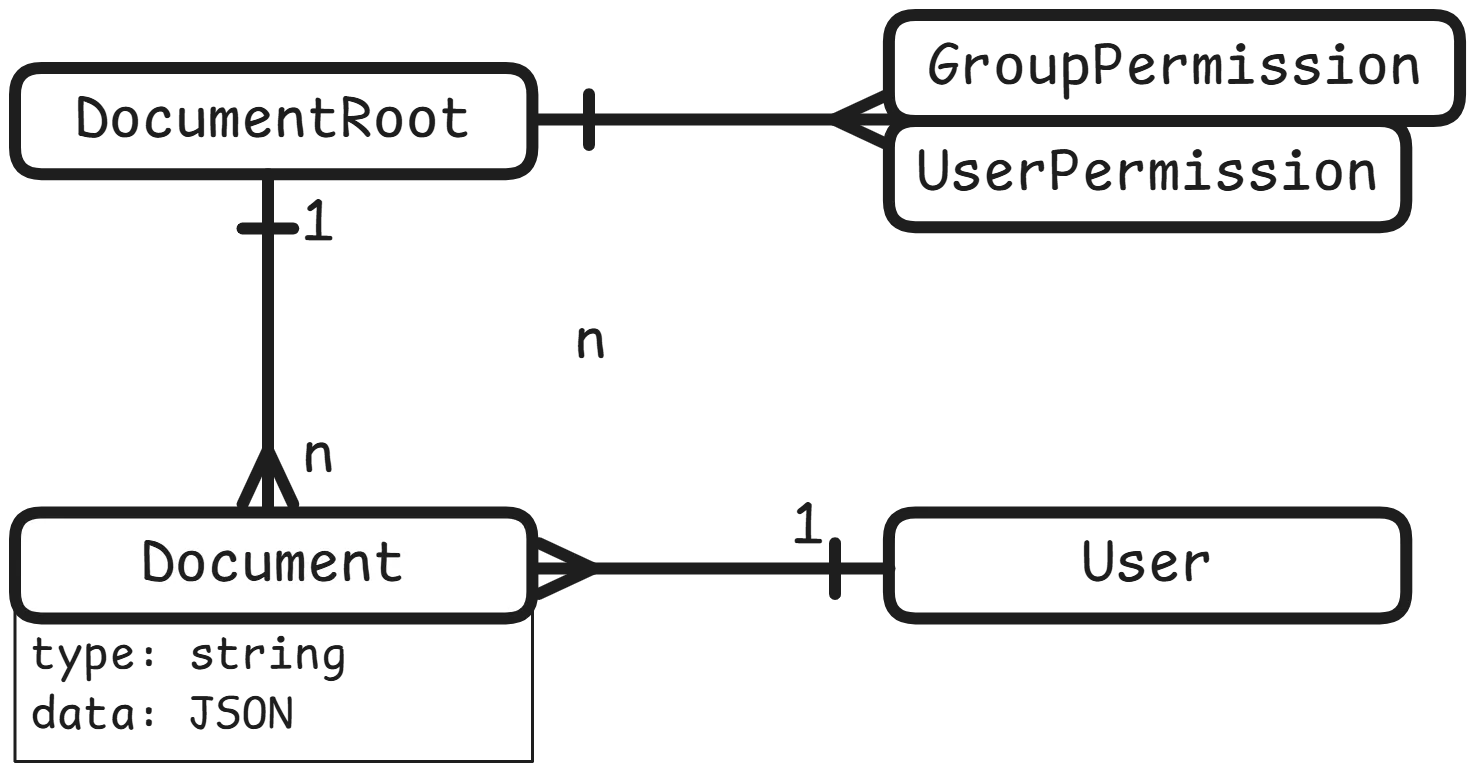 Speicherbare Dokumente sind über eine DocumentRoot in einem Markdown-File "verankert". Es wird also direkt im Markdown-File eine UUID definiert, welche als eindeutiger Bezeichner für die DocumentRoot dient. Darauf kann sowohl die Berechtigung (Gruppen- oder Benutzerzuweisung) festgelegt, wie auch Benutzerspezifisch ein- oder mehere Documents hinzugefügt werden.